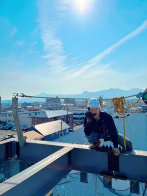 空の下で風を感じながら鉄骨を組み上げ、